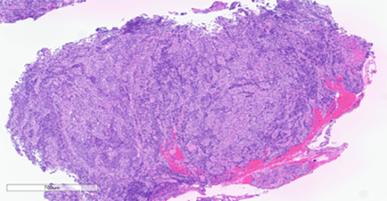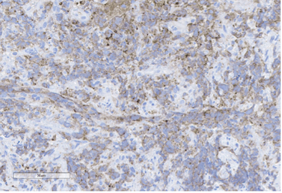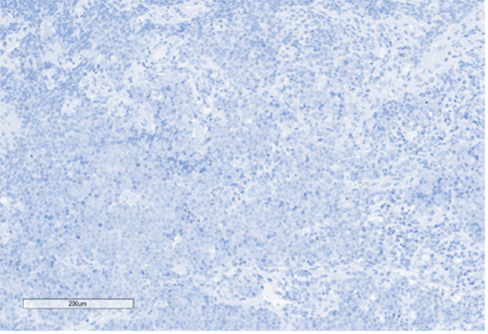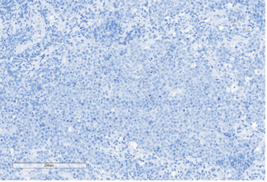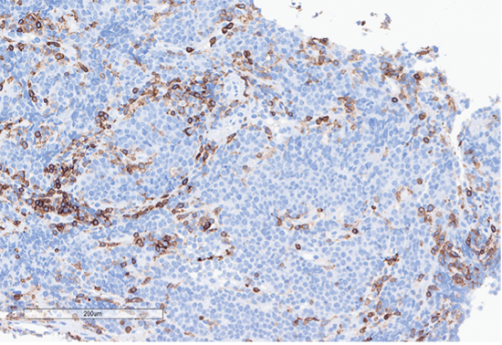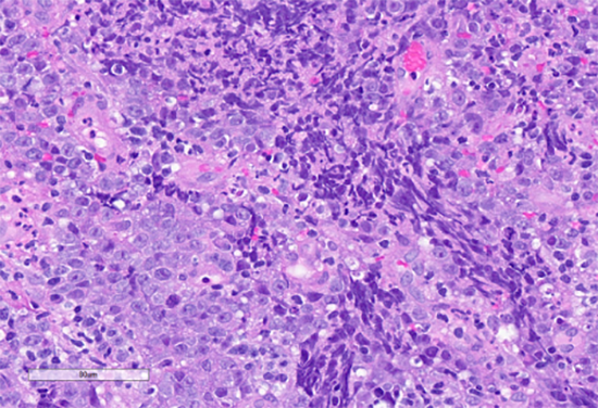 The histologic sections of the biopsied gastric cardia mass showed discohesive sheets of highly atypical cells with patchy areas of tumor necrosis. Scant residual background gastric cardia-type mucosa is identified. On high power the tumor cells are predominantly epithelioid and notable for prominent nucleoli, increased nuclear to cytoplasmic ratio, nuclear membrane irregularity and a marked increase in mitotic activity. A prominent lymphoid component, consisting predominantly of small lymphocytes, was interspersed between the atypical epithelioid cells. The tumor was poorly differentiated and based on histologic features alone, a definitive cell lineage could not be determined. A broad immunohistochemical (IHC) panel was required to determine the cell lineage with differentials including carcinoma, lymphoma, sarcoma, melanoma and germ cell tumors alike.