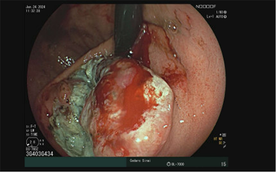 Figure 1: Endoscopic appearance of the bleeding and fungating gastric cardia mass.