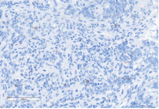 Epithelial membrane antigen (EMA) and pancytokeratins (Oscar & 8/18) were focally positive in the epithelioid tumor cells. CD3 and CD20 highlighted the background lymphocytes. The following IHC markers were negative in the tumor cells: CD45, SOX10, desmin, CD117, DOG-1, SALL4, synaptophysin, chromogranin and P40. EBER (in-situ) was negative. IHC for DNA mismatch repair (MMR) proteins showed intact expression. PD-L1 CPS score was <1. IHC for BRG1 (SMARCA4) and INI-1 (SMARCB1) were performed to examine components of the SWI/SNF chromatin-remodeling complex. INI-1 (SMARCB1) showed retained nuclear expression, however, complete loss of nuclear expression for BRG1 (SMARCA4) was identified. Subsequent genomic profiling showed copy number losses for SMARCA4 and 9p (CDKN2A/2B). TP53 and FBXW7 missense alterations were also identified. The overall findings were most compatible with the rarely described BRG1 (SMARCA4)-deficient undifferentiated gastric carcinoma.