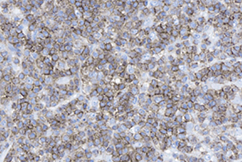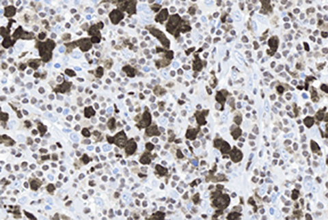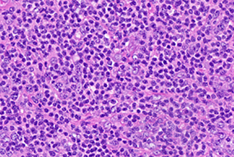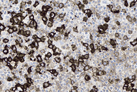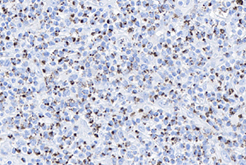 In the lymph node, the principal T-cell lymphoma differential diagnosis includes peripheral T-cell lymphoma NOS (PTCL-NOS) and angioimmunoblastic T-cell lymphoma (AITL). A key feature of ALCL's are pleomorphic, horseshoe-shaped "hallmark" cells which may be variable in size. The tumor cells are strongly CD30 positive (with large cells typically stronger than small cells), unlike the other entities previously mentioned. Additionally, ALCL expresses cytotoxic markers such as TIA-1 (unlike PTCL-NOS) but do not express follicular helper cell markers such as PD1 or have expanded/disrupted follicular dendritic cell networks (unlike AITL).