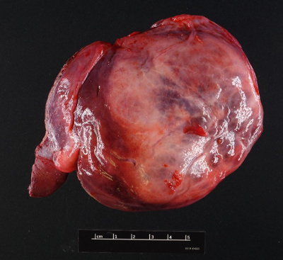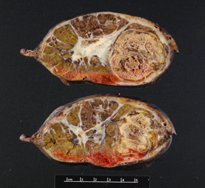 Figure 2. (Gross Photo, Cross Section) Cross sections show multilobulated tumor with areas of necrosis and central scarring.