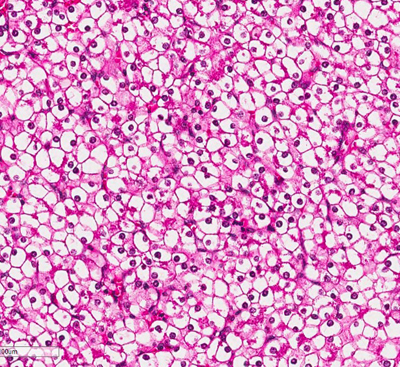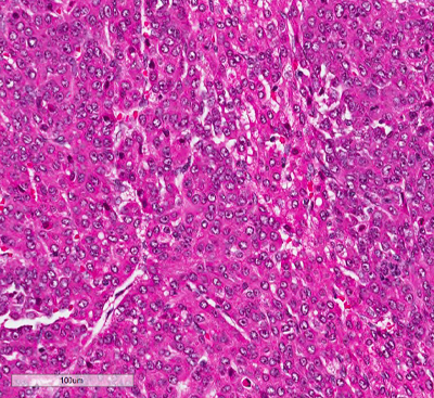 Figure 3. (Microscopic Photo, 20x) The fetal pattern of the tumor is composed of uniform cells resembling normal fetal hepatocytes. The cells are small with round centrally located nuclei, abundant clear to pink cytoplasm, and have distinct membranes.