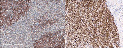 Figure 6. (Microscopic Photo, 10x) IHC for Beta-Catenin shows tumor with nuclear staining and membranous staining.
