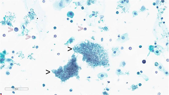 Figure 1: Lung FNA, SurePath, Papanicolaou stain: foamy amorphous materials (black arrowheads), and Cryptococcus organisms (white arrowheads).