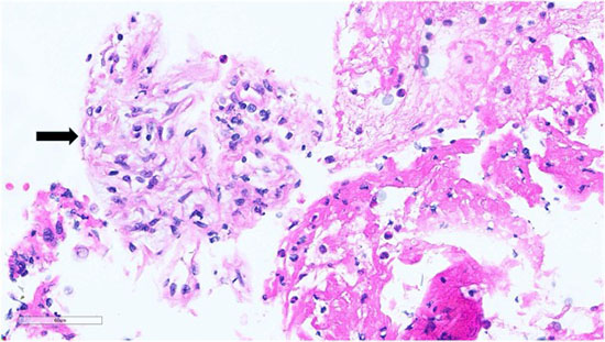 Figure 2: Lung FNA, Cell Block, Hematoxylin and eosin stain: epithelioid histiocytes and lymphocytes suggestive of ill-formed granuloma (black arrow)