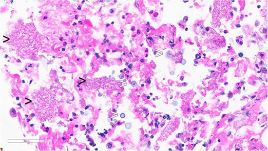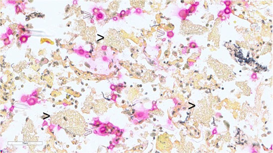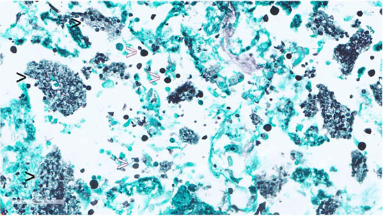 Figure 5: Lung FNA, Cell Block, Mucicarmine stain: highlights mucinous capsule of Cryptococcus species (white arrowheads) and negative in foamy amorphous materials (black arrowheads).