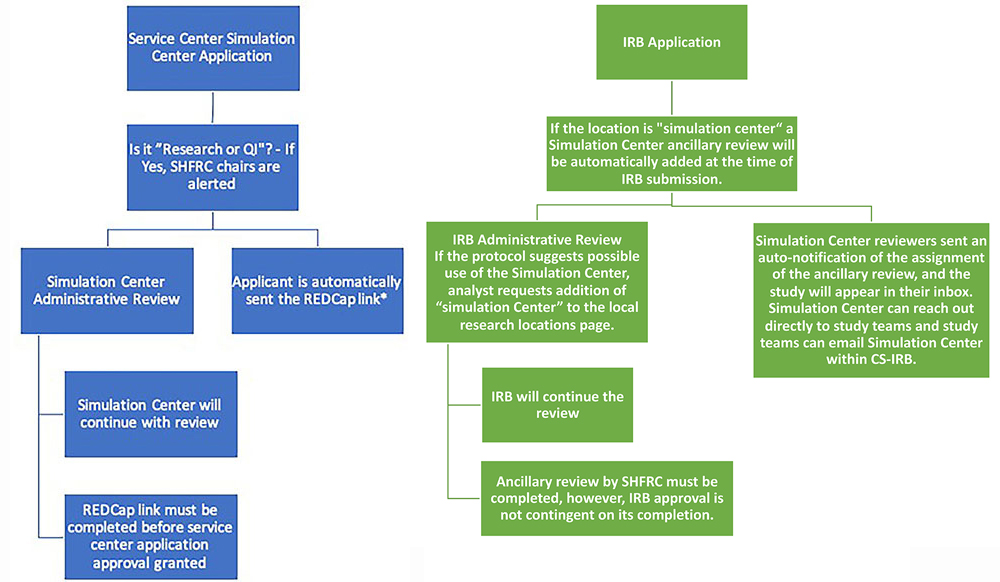 If you are interested in conducting research using any of the simulation center resources (e.g., the facility, the simulators, etc.) you will need to submit a request through the service center to use the space. If the service center application has Research or QI checked off, you will be directed to a REDCap survey that notifies the SHFRC co-chairs of the research activity and evaluate the proposed research plan.