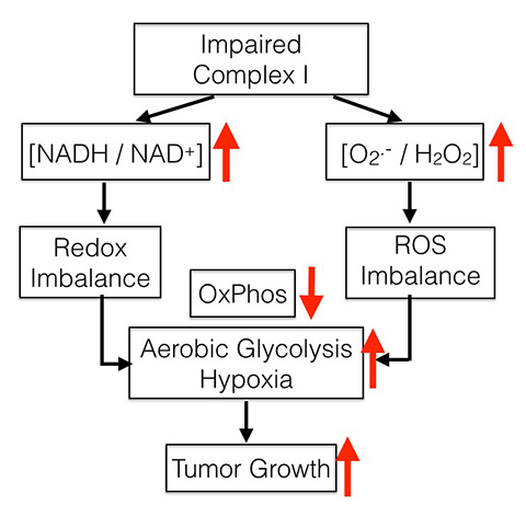 Figure 2: Schematic of how impairments in mitochondrial complex I function can lead to a cascade of metabolic deficits promoting/sustaining cancer growth in animal models and human patients.