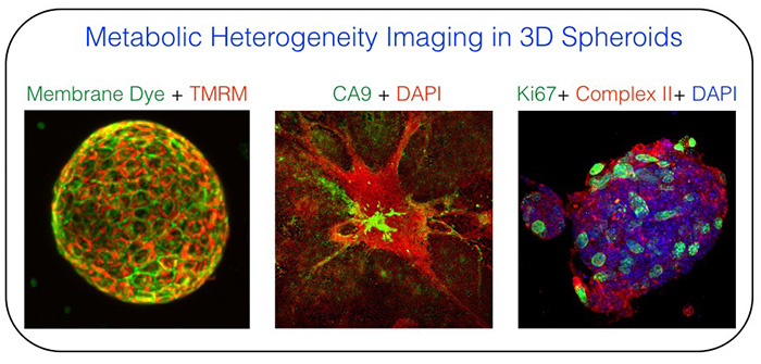 Figure 3: Representative images of 3-D mammary epithelial spheroids labeled with mitochondrial membrane potential marker, hypoxia marker (carbonic anhydrase 9), cell proliferation marker (Ki-67), mitochondrial matrix marker (complex II subunit) and nuclear marker (DAPI). We are developing tools to obtain functional correlation between tumor heterogeneity, tumor cell proliferation and mitochondrial function in 3-D architectures.