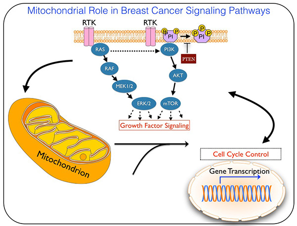 Figure 1: Normal cells have controlled orchestration of growth factor signaling pathways and cell cycle control networks. Aberrations in one or more of these components lead to cancer; our research is focused on the role of mitochondrial function in modulating these critical cancer-associated signaling pathways.