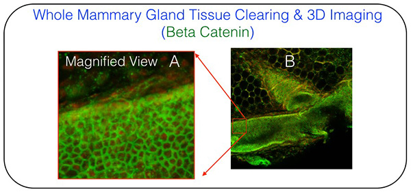 Figure 4: Representative image showing single-cell resolution imaging in whole mouse mammary gland (approximately 500 microns thick) cleared and labeled with epithelial cell surface marker beta-cateni.