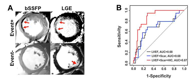 Iron Deposits with Chronic Infarction Territories as a Novel Marker of Arrhythmia Risk. Presence of hypointense core (HIC) within representative chronic infarction territories on bSSFP images (A) and (B) their predictive value for the primary endpoint (occurrence of appropriate ICD therapy, survived cardiac arrest or sudden cardiac death) A: Representative bSSFP and LGE CMR images from two patients receiving ICD therapy; one who met the primary endpoint (Event+) and one who did not meet the primary endpoint (Event-). For the Event+ patient, blue arrows denote the MI region on Late Gadolinium Enhancement (LGE) imaging and the Hypo-Intense Core (HIC) region on bSSFP imaging. In the Event- patient, no HIC were observed by bSSFP within the MI region, indicated by the red arrow on LGE imaging. B: Corresponding ROC curves for LVEF, LVEF+Scar Volume and LVEF+Scar Volume+HIC for the prediction of the primary endpoint. While the addition of Total Scar Volume alone did not improve the predictive accuracy over LVEF, the addition of HIC improved the AUC from 0.69 to 0.87, suggesting additional prognostic value of HIC. http://circimaging.ahajournals.org/content/8/8/e003642.