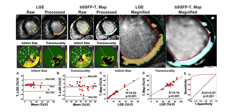 Characterizing Chronic MI in Patients. Typical short-axis LGE images and non-contrast bSSFP-T1 maps from a STEMI patient with chronic MI at 3T are shown. MI (highlighted dark-blue pixels in the processed images) was identified on both LGE images and bSSFP-T1 maps. Bulls-eye plots depicting the size and transmurality of the MI are shown for both LGE and T1. Similar to canines, excellent correlations were observed between LGE images and bSSFP-T1 maps in terms of the location, spatial extent and transmurality of the infarcted myocardium. bSSFP-T1 maps and LGE images were not different for measuring infarct size (p=0.90) and transmurality (p=0.52). Bland-Altman analysis showed excellent agreement between LGE and bSSFP-T1 maps for measuring infarct size (A) and transmurality (B). Excellent correlations were observed between LGE images and b-SSFP T1 maps for infarct size (R2=0.92; C) and transmurality (R2=0.76; D). ROC analysis showed that the area under the curve was 0.96 (E). doi:10.1016/j.jcmg.2015.04.018.