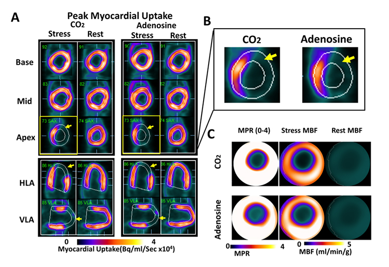 Regional Myocardial Blood Flow Response to Hypercapnia and Adenosine in the Presence of Coronary Stenosis are the Same. Panel A shows representative short- (base, mid, apex) and long-axis (HLA and VLA) PET images of peak myocardial uptake of 13N-ammonia during hypercapnia of PaCO2 ~ 60 mmHg (CO2), standard clinical dose of adenosine (Adenosine), and at rest with PaCO2 ~ 35 mmHg (rest), in a canine with a coronary stenosis of the LAD. Note the differentially lower uptake of the radiotracer in the anterior lateral wall (as evidenced by the lower signal in myocardial segments supplied by the distal LAD; yellow arrows) under hypercapnia and adenosine. For ease of visualization, reduced tracer uptake in the LAD territory during peak uptake in remote regions (i.e., those not impaired by coronary stenosis) is highlighted in the zoomed-in apical short-axis image under hypercapnia and adenosine in Panel B. For the case in Panel A, rest and stress MBF (under hypercapnia and adenosine) and corresponding MPR are shown as polar maps in Panel C. These images show a marked preferential reduction in MBF and MPR in the supply regions of the LAD, which are visually evident and spatially consistent under hypercapnia and adenosine.