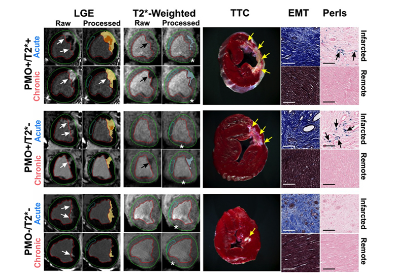 Persistent Microvascular Obstruction in Reperfused Myocardial Infarction Leads to Chronic Iron. Representative in-vivo raw and processed LGE and T2*-weighted images from reperfused canines acquired in both acute and chronic phases post-MI are shown. Arrows point to the sites of MI and iron deposition on LGE and T2*-weighted images, respectively. Corresponding ex-vivo histological sections stained with TTC, EMT and Perls stain are also shown. Scale bars in the microscopic histology images correspond to 50μm. Note the significant chronic iron deposition in the PMO+/T2*– group, despite the absence of acute reperfusion hemorrhage. Perls stain confirmed the presence of chronic iron deposition (blue deposits pointed at by the arrows) in the PMO+/T2*+ and PMO+/T2*– groups, but not in the PMO–/T2*– group. EMT stains showed significant fibrosis in the infarcted territory compared to a very mild diffuse fibrosis in the remote territory, which were not visually evident on LGE. Asterisks in the T2*-weighted images point to the sites of off-resonance artifacts that were manually excluded in the final analysis.