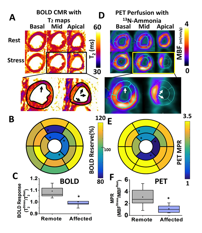 Fast (<5 minutes), Heart-Rate-Independent, Whole-Heart, Free-Breathing, Three-Dimensional Myocardial BOLD MRI at 3T and 13N-ammonia PET at Rest and Under Adenosine Stress in Canines with LAD Coronary Stenosis. Panel A shows representative basal, mid and apical short-axis T2 maps at rest and under stress, from a canine with LAD coronary stenosis. Panel D shows the corresponding quantitative myocardial blood flow (MBF) maps determined from 13N-ammonia PET. Note the close correspondence in the MBF distribution and T2 maps, particularly under adenosine stress. Specifically, the remote territories on PET images showed increased T2 values on T2 maps acquired under adenosine. Conversely, the affected territories on PET images (anterior wall corresponding to LAD territory; white arrows in zoomed-in images) showed markedly diminished increase in T2 (black arrows in zoomed-in images) compared to remote segments. Corresponding polar maps for BOLD and PET are shown in Panels B and E, respectively. Affected segments identified with change analysis from QPET are labeled with ‘+’ in the polar maps. Both BOLD Response and PET MPR showed significantly lower values in the affected territories compared to the remote segments (Panels C and F, respectively).