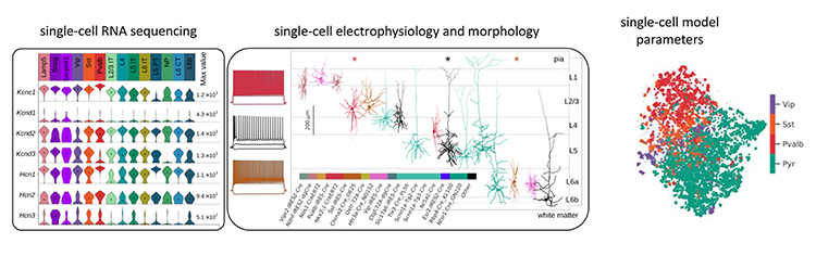 Identifying the cell types constituting brain circuits is a fundamental question in neuroscience and motivates the generation of taxonomies based on electrophysiological, morphological and molecular single-cell properties. Establishing the correspondence across data modalities and understanding the underlying principles has proven challenging. Biorealistic computational models offer the ability to probe cause-and-effect and have historically been used to explore phenomena at the single-neuron level. The Anastassiou Lab introduced a computational optimization workflow used for the generation and evaluation of thousands of single-neuron models with active conductances. These models were based on hundreds of in vitro electrophysiological experiments followed by morphological reconstruction from the mouse visual cortex. We show that despite biological variability and optimization complexity, the generated models are robust representations and realizations of individual experiments as well as cortical cell types as defined via cellular electrophysiology or transcriptomics. We also show that differences in specific conductances predicted from the models reflect differences in gene expression in excitatory and inhibitory subclasses supported by single-cell RNA sequencing. The differences in model conductances, in turn, explain electrophysiological differences observed between the cortical subclasses. Such large-scale computational effort reconciles single-cell data modalities that define cell types and enables causal relationships to be examined.