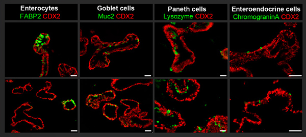 Upper panel shows that induced pluripotent stem cells generated from lymphoblastoid cell lines can be directed to form human intestinal organoids that are immunopositive for the intestinal transcription factor CDX2 and the intestinal epithelial subtypes, including goblet cells (Muc2+), enteroendocrine cells (CGA+), enterocytes (FABP2+) and Paneth cells (Lysozyme+). The lower panel shows similar organoids that were generated from induced pluripotent stem cells that were derived from dermal fibroblasts. Scale bar = 75 μm. (Barrett R, Ornelas L, Yeager N, Mandefro B, Sahabian A, Lenaeus L, Targan SR, Svendsen CN, Sareen D. Stem Cells Transl Med. 2014;3(12):1429-1434.)