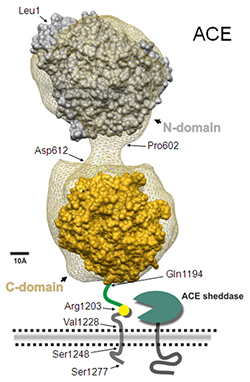 ACE is a zinc-dependent dicarboxypeptidase that is responsible for the hydrolysis of angiotensin I to angiotensin II. ACE also cleaves several other peptides. Kenneth Bernstein, MD first started working on the ACE protein in 1986 and headed one of the two groups that cloned the ACE gene in 1988/1989. This work demonstrated that, while ACE is a single polypeptide chain, it is composed of two homologous catalytic domains, each of which is independently catalytic. These domains are now called the N-domain and the C-domain. One important goal of Bernstein's research is to understand the precise and unique function of each ACE domain. Two mouse strains created by Bernstein, with point mutations introduced into the ACE gene that selectively inactivate either the ACE N- or C-domain, have proven to be a major resource in studying these functions. These mice, termed N-KO and C-KO, have been used to show that the two ACE domains are not equivalent in biological function.