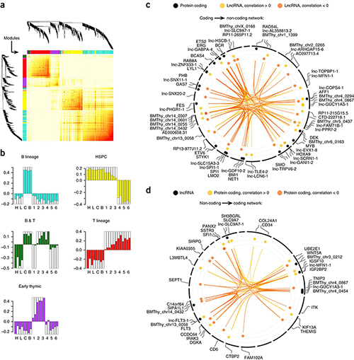 Figure 1. Identification of lineage- or differentiation-stage–specific lncRNA gene–protein-coding gene co-expression modules. From Long non-coding RNA profiling of human lymphoid progenitor cells reveals transcriptional divergence of B cell and T cell lineages. Casero D, Sandoval S, Seet CS, Scholes J, Zhu Y, Ha VL, Luong A, Parekh C, Crooks GM. Nat Immunol. 2015;16:1282–1291.