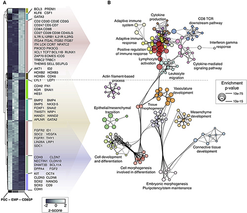 Figure 2. Gene expression changes during the transition from PSC to hEMP to CD8SP T cells. From Organoid-induced differentiation of conventional T cells from human pluripotent stem cells. Montel-Hagen A, Seet CS, Li S, Chick B, Zhu Y, Chang P, Tsai S, Sun V, Lopez S, Chen HC, He C, Chin CJ, Casero D, Crooks GM. Cell Stem Cell. 2019 Mar 7;24(3):376-389.e8.