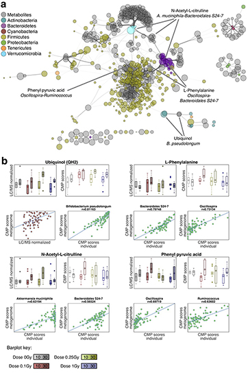 Figure 2. Metabolic network modeling and taxa-metabolite associations. From Space-type radiation induces multimodal responses in the mouse gut microbiome and metabolome. Casero D, Gill K, Sridharan V, Koturbash I, Nelson G, Hauer-Jensen M, Boerma M, Braun J, Cheema AK. Microbiome. 2017 Aug 18;5(1):105.