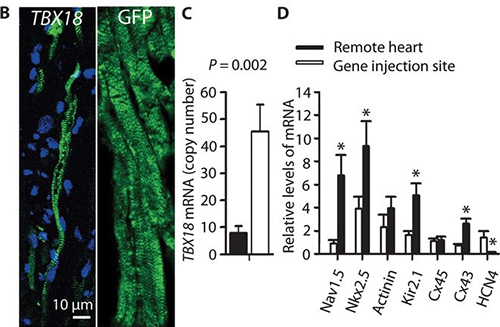 Electronic pacemakers are devices that treat slow heart rhythms in patients afflicted with cardiac conduction system disorders causing slow heart rate (HR) and symptoms such as syncope. They have been successfully used for more than 50 years with continuous refinement but are limited in some instances by complications ranging from inadequate autonomic support to lead fracture, infections and adverse cardiac remodeling. Biological pacemakers—i.e., pacemakers that are created by cell or gene therapy—have been developed with the goal of replacing electronic devices. The prevalent approaches to date have used functional reengineering (overexpression of one or more ion channels) to create abnormal automaticity in working chamber myocytes; proof of concept has been primarily at the cellular and small-animal levels, with few follow-up translational studies (those designed in large animals and using clinically feasible delivery methods). Our lab focuses on gene delivery by overexpression of adenovirus and/or chemical modified mRNA encoding transcription factor Tbx18. T-box 18 (Tbx18) converts ordinary ventricular cardiomyocytes into pacemaker cells, also called induced sinoatrial node (iSAN) cells. Such pacemaker conversion has been shown to effectively treat heart block in small animals. This somatic reprogramming approach differs from functional reengineering by providing a template for recapitulating genuine SAN function, with all its nuances. In no disease conditions (in both rodents and humans), the SAN is a compact tissue composed of specialized pacemaker cells that fire spontaneous electrical impulses determining the individual’s HR.