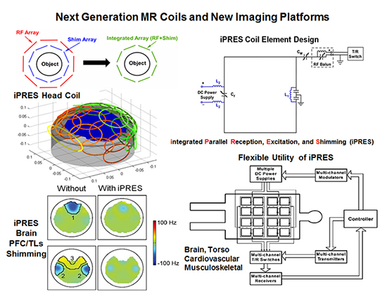 Current research in the Han Laboratory focuses on implementing the integrated Parallel Reception, Excitation and Shimming (iPRES) coil design for magnetic resonance imaging (MRI). The new iPRES technology combines radio frequency (RF) and direct currents in one single coil array rather than using separate arrays for parallel RF reception and B0shimming. iPRES relies on a novel circuit design that allows a radio frequency current (for excitation/reception) and a direct current (for B0 shimming) to coexist independently in the same coil without undesired interference. The underlying principle — that currents or waves at different frequencies can coexist independently in the same conductor or media without undesired interference between them — is simple and is found widespread in electrophysics and communications applications.