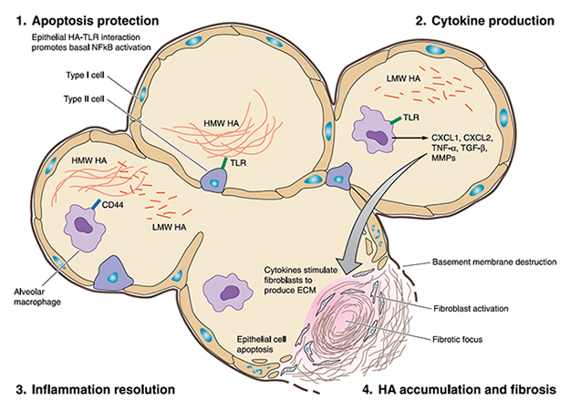 Figure 1. The roles of hyaluronan (HA) during lung injury and fibrosis, shown in four alveoli. 1) Epithelial HA-TLR interaction provides basal NF-κB activation to prevent type II cell apoptosis. 2) During tissue injury, HA accumulates, and low-molecular-mass HA fragments stimulate macrophages to release chemokines, cytokines, and growth factors. 3) CD44 on macrophages can promote the inflammatory resolution and HA clearance. 4) Cytokines and growth factors in turn stimulate fibroblasts to produce collagen, fibronectin and HA, which further worsen fibrosis.