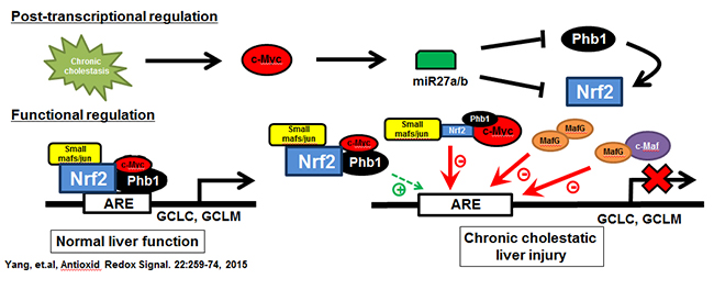 Figure 1. Chronic cholestasis triggers c-Myc up-regulation, which induces miR-27a/b that in turn lowers the expression of its target mRNAs, prohibitin 1 (Phb1) and Nrf2. In normal liver the expression of glutamate-cysteine ligase (GCL, made up of catalytic or GCLC and modifier or GCLM subunits), the rate-limiting enzyme in GSH synthesis, is positively regulated by Nrf2-mediated trans-activation of the anti-oxidant response element (ARE). Nrf2 heterodimerize with other proteins such as small Mafs or Jun to trans-activate ARE. We found in addition to these, c-Myc and Phb1 also interact with Nrf2 at ARE. While c-Myc serves as a co-repressor, Phb1 is a co-activator. During cholestasis, induction of MafG and c-Maf also occur and they form complexes to inhibit ARE. These changes all work together to down-regulate GCLC and GCLM expression, GSH level, further exacerbating liver fibrosis. From Yang, et al, Antioxid Redox Signal. 2015;22:259-274.