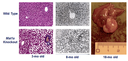 The second research program in the Lu Laboratory examines the role of SAMe in liver function and injury. SAMe is synthesized by methionine adenosyltransferase 1A (MAT1A) in the liver. Hepatic MAT activity decreases in cirrhosis of all causes. This is due to inactivation of the enzyme as well as decreased MAT1A expression. In collaboration with José Mato, PhD, the Lu Lab developed the Mat1a knockout (KO) murine model. Not only do these KO animals develop spontaneous steatohepatitis, but over time they also manifest a high frequency of hepatocellular carcinoma (HCC) (Figure 2).