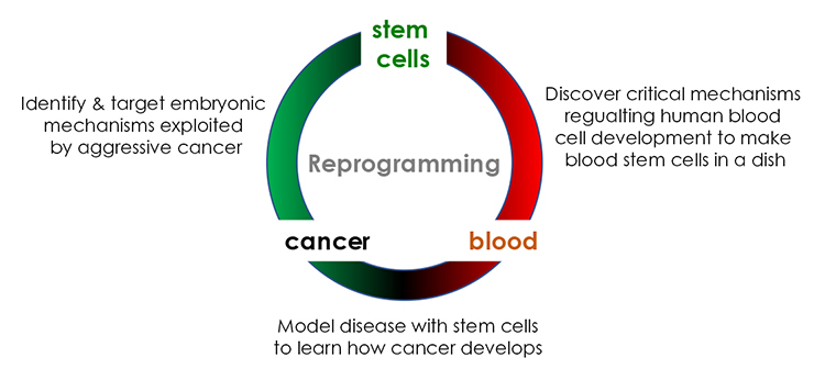 Although human pluripotent stem cells (i.e., embryonic stem cells and induced pluripotent stem cells) have the potential to differentiate into any cell lineage in the human body, researchers have not yet been able to obtain fully functional cells for some cell types. A long-standing hurdle in the hematopoietic field has been the inability to differentiate human pluripotent stem cells into fully functional hematopoietic stem cells (HSCs), the cells that enable long-term reconstitution of the entire blood system. One focus of the Panopoulos Laboratory uses reprogramming and genomic analysis to identify novel developmental deficiencies that exist in current blood cell differentiation protocols, in hopes of obtaining fully functional human HSCs in vitro from pluripotent cells that could be used in the clinic. We are also using reprogramming to generate tissue culture models of leukemogenesis for comparative analysis, to collectively identify novel mechanisms regulating both normal and aberrant blood cell development. Why blood? If we were able to successfully make HSCs from human iPSCs (i.e., make blood stem cells “in a dish”), then it is our hope that patients in need of a bone marrow transplant would no longer have to wait to find a bone marrow matched donor, and we could treat numerous blood diseases in ways we were not able to before.