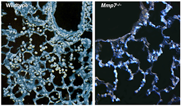 Figure 2. Shortly (16 h) after bleomycin-induced acute injury, numerous neutrophils have moved from the vasculature into the alveolar space. However, in Mmp7–/–mice, neutrophil emigration (cyan cells) is halted at the alveolar:interstitial interface. (Li et al., Cell 111:635–646, 2002).