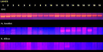 Gel electrophoresis of PCR amplification on total versus methane-producing gut bacteria. |