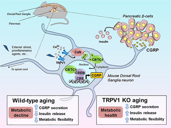 Previously, the Riera Laboratory reported the role of the transient receptor potential vanilloid 1 (TRPV1), a chemosensory receptor present on afferent Aδ and C sensory fibers projecting to dorsal root ganglia (DRG), in the onset of metabolic decline with age (Riera et al. Cell. 2014). Lack of TRPV1 neurons decreases circulating levels of calcitonin gene-related peptide (CGRP), a neuropeptide implicated in pain responses, neuro-immune communication and vasodilation. Because CGRP levels increase in old animals, Riera Lab research showed that high CGRP levels cause metabolic decline in wild-type animals through blockade of insulin secretion with age. Importantly, pharmacological inhibition of CGRP receptors restores metabolic health in old mice and improves age-dependent loss in insulin secretion. These data highlight a role for the neuropeptide CGRP as a critical regulator of metabolic flexibility upon aging and suggest that DRG fibers may contribute to metabolic homeostasis through neuropeptidic communication with visceral organs. Research in the lab will aim at characterizing the role of CGRP and sensory fibers in visceral tissues to modulate physiological functions and impact on metabolic regulation.
