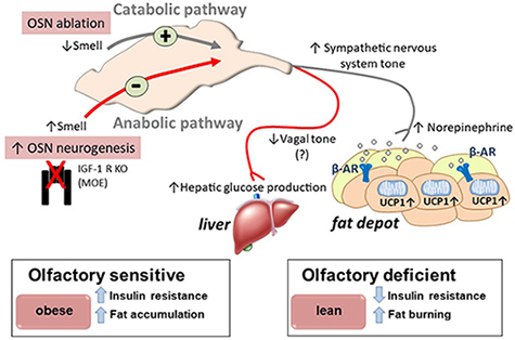 Obesity is often associated with abnormal feeding behavior implicating central nervous system motivation and feeding centers. The sense of smell is intrinsically connected to food palatability; however, whether olfactory inputs affect energy homeostasis remained unclear. The Riera Laboratory investigates how olfactory sensory neurons (OSNs) regulate whole body metabolism and energy homeostasis. Recently, the lab demonstrated that acute loss of smell perception after obesity onset not only abrogates further weight gain but also improves fat mass and reduces insulin resistance (Riera et al. Cell Metabolism. 2017). Reduced olfactory input activates sympathetic nerve activity, resulting in stimulation of β-adrenergic receptors (β-AR) on white and brown adipocytes to promote lipolysis. Conversely, conditional ablation of the insulin-like growth factor 1 receptor in OSNs enhances olfactory performance in mice by improving OSN neurogenesis and leads to increased adiposity and insulin resistance. These findings unravel a new bidirectional function for the olfactory system in controlling energy homeostasis in response to sensory and hormonal signals.