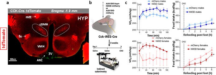 Dorsomedial hypothalamus in the regulation of energy balance. A. tdTomato expression the hypothalamus (HYP) in CCK-cre; Ai14 female mice showing select presence of CCK in neurons from the compact DMH (cDMH). CCK neuronal projections are visible in the arcuate nucleus (ARC), fornix (fx) and mamillothalamic tract (mtt). B. Experimental design for chemogenetic manipulation of Cck-expressing neurons in the DMH. c. Oxygen consumption (VO2) is robustly increased upon DMH-CCK stimulation; Food intake is reduced following chemogenetic activation of DMH-CCK neurons