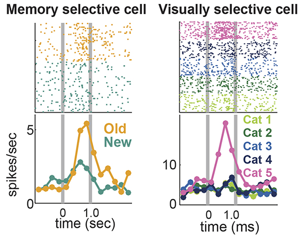 Example cells in the human medial temporal lobe that are selective for memory (left) and visual categories (right).