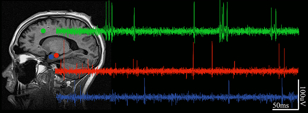 Example extracellular recordings from three different brain areas in a patient with implanted electrodes. |