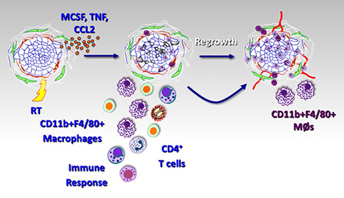 Radiation (RT) and other cytotoxic therapies can elicit cell death that is recognized by the immune system (aka “immunogenic cell death”). This anti-tumor immunity invoked by therapy generates an inflammatory response that consists of innate immune cells (myeloid cells, macrophages, DCs, NK cells) and adaptive immune cells (CD4+ and CD8+ T cells). Numerous studies have demonstrated that this immune response elicited by treatment is critical for optimal therapeutic efficacy. Our lab and others have found that the CD11b+ myeloid-macrophages that appear in tumors following RT work to restrain RT-mediated anti-tumor immunity. Further, RT itself seems to produce a signal that leads to the generation of a suppressive myeloid phenotype following treatment through several different mechanisms. We are currently exploring some of these mechanisms to identify and target the signals that lead to the generation of intratumoral suppressive myeloid cells.