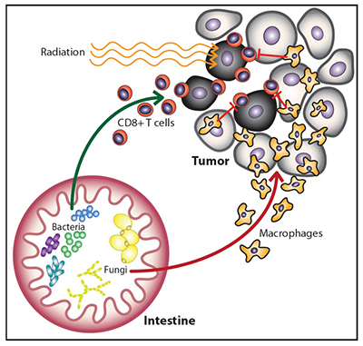 Multiple groups have shown that the bacterial microbiome can influence the response to immunotherapy and chemotherapy. In our recent Cancer Cell paper, our group found that commensal bacteria are similarly necessary for optimal responses to radiation (RT). Surprisingly, we also found that in the absence of bacteria, commensal fungi can and do proliferate. Increasing commensal fungi leads to increasing immunosuppressive activity within the tumor microenvironment. Targeting the commensal fungi enhances the efficacy of RT by reducing suppression of the RT-induced anti-tumor immune response. We are currently exploring the molecular mechanisms underlying the connection between commensal fungi and anti-tumor immunity.