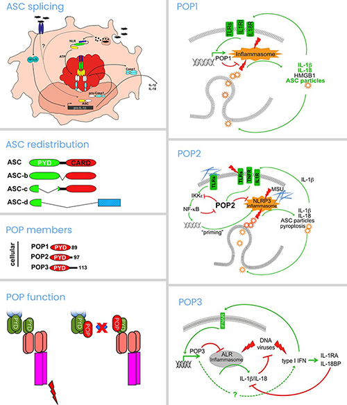Cellular mechanisms include the disruption of the inflammasome complex by PYD-only proteins (POPs) and CARD-only proteins (COPs), as well as post-translational protein modifications. Our research contributed to the discovery of several key aspects of inflammasome biology and the inflammatory response. The Stehlik and Dorfleutner Lab generated several unique mouse models for studying inflammasome regulation in vivo. We discovered ASC as the essential adaptor for caspase-1 activation, were the first to visualize the endogenous inflammasome speck in macrophages and described several mechanisms by which ASC regulates inflammasomes, including by induced subcellular redistribution and splicing. The lab also discovered the NLRP7 inflammasome in human macrophages. In addition, we described the function of COPs and discovered the first, and subsequently all other POPs, thereby establishing the POP family of inflammasome regulators. We described their unique role in vivo and generated an inflammasome-targeting proof-of-concept therapy for inflammatory disease. Current work focuses on several novel- inflammasome components that either positively or negatively regulate the response and how these proteins shape inflammatory and autoimmune disease.